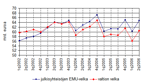 Julkisyhteisöjen EMU-velka oli 64,8 miljardia euroa vuoden 2006 toisen vuosineljänneksen lopussa. Runsaan neljän miljardin euron kasvu johtui pääasiassa valtion lyhytaikaisten lainojen ja joukkovelkakirjalainojen kasvusta. Velan määrä palasi ensimmäisen vuosineljänneksen pudotusta edeltävälle, vuoden 2005 lopun tasolle.