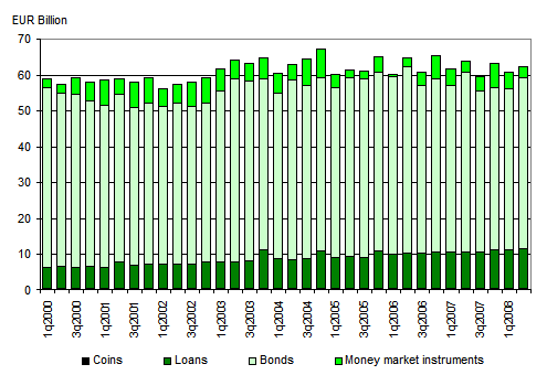 General government EMU debt at nominal prices grew by EUR 1.4 billion in the second quarter of 2008. The growth in debt is due to central government indebtedness. At the end of the second quarter general government debt totalled EUR 62.3 billion, which was, however, EUR 1.5 billion less than one year earlier.