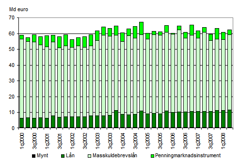 Den offentliga sektorns nominella EMU-skuld ökade med 1,4 miljarder euro under det andra kvartalet år 2008. Skulden ökade till följd av statens skuldsättning. I slutet av det andra kvartalet var den offentliga sektorns skuld 62,3 miljarder euro, vilket ändå var 1,5 miljarder euro mindre än året innan.