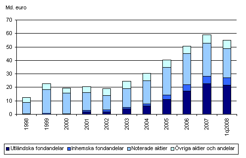 Till följd av aktiekursernas negativa utveckling minskade marknadsvärdet för den offentliga sektorns aktier och övriga andelar med 7,7 miljarder euro även om den offentliga sektorn samtidigt placerade ytterligare 2,4 miljarder euro i aktier. Arbetspensionsanstalterna har redan länge ökat sitt ägande i utländska fonder. I slutet av kvartalet var redan närmare 40 procent av alla aktieplaceringar placerade i dem.