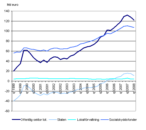 Den offentliga sektorns finansiella nettotillgångar började minska under det sista kvartalet i fjol och fortsatte att minska under det första kvartalet år 2008 med 5,9 miljarder euro till 121,9 miljarder euro. Statens finansiella nettotillgångar minskade med 3,9 miljarder euro och socialskyddsfondernas med 2,1 miljarder euro. Minskningen av statens och socialskyddsfondernas finansiella nettotillgångar berodde särskilt på kapitalförluster till följd av den ogynnsamma kursutvecklingen på aktiemarknaderna. Lokalförvaltningens finansiella nettotillgångar var nästan oförändrade jämfört med det föregående kvartalet.