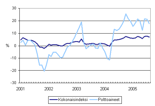 Kuorma-autoliikenteen kaikkien kustannusten ja polttoainekustannusten vuosimuutokset 1/2001 - 8/2005