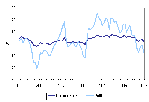 Kuorma-autoliikenteen kaikkien kustannusten ja polttoainekustannusten vuosimuutokset 1/2001 - 1/2007