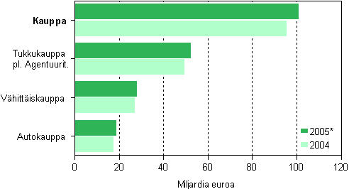 Kaupan toimiala koostuu auto-, tukku- ja vähittäiskaupasta sekä agentuuritoiminnasta. Ennakkotilaston mukaan kaupan yritysten liikevaihto oli 101,3 miljardia euroa vuonna 2005, kasvua edelliseen vuoteen nähden oli 5,6 miljardia euroa, muutosprosentin ollessa 5,8. Tukkukauppa keräsi lähes 52 prosenttia kaupan liikevaihdosta. Autokaupan osuus oli 19 ja vähittäiskaupan 28 prosenttia.
