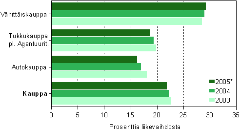 Kaupan liikevaihto kohosi vuonna 2005 Tilastokeskuksen ennakkotietojen mukaan 101,3 miljardiin euroon, kasvua edellisestä vuodesta oli 5,8 prosenttia. Kaupan liikevaihdon 5,6 miljardin euron kasvusta puolet tuli tukkukaupasta. Tukkukauppa keräsi liikevaihtoa 52,5 miljardia ja vähittäiskauppa 28,4 miljardia euroa. Autokauppa kasvoi edellisvuoden tapaan voimakkaasti. Liikevaihtoa autokaupat keräsivät 19,1 miljardia euroa, kasvuprosentin ollessa 8,2.