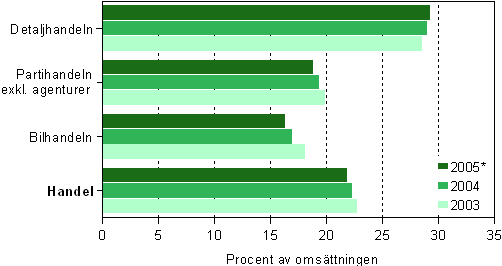 Nyckeltalen för lönsamheten blev något svagare inom handeln med undantag av totalresultatet och resultatet av räkenskapsperioden. Efter att verksamhetsutgifterna avdragits var driftsbidraget 4,4 miljarder euro, dvs. 4,3 procent av rörelsens intäkter. Av räkenskapsperiodens resultat hänförde sig 3,2 miljarder euro till handeln. Jämfört med året innan förekom det inga väsentliga ändringar i parti- och detaljhandelns lönsamhet. Däremot blev lönsamheten svagare inom bilhandeln både i euro och räknat enligt alla nyckeltal. Bilhandelns driftsbidrag var 576 miljoner euro, vilket var 99 miljoner euro mindre än år 2004.
