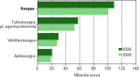 Kaupan liikevaihto oli ennakkotilaston mukaan 109 miljardia euroa vuonna 2006, josta kasvua edellisvuoteen oli 8,1 miljardia euroa. Liikevaihdosta pk-yritysten osuus oli 41,8 miljardia euroa. Liikevaihdon kasvusta pk-yritysten osuus oli miljardi euroa. Samalla pk-yritysten liikevaihto-osuus kaupan alalla laski 38,4 prosenttiin.