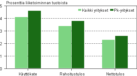 Pk-sektorille kertyi käyttökatetta 1,9 miljardia euroa, mikä oli vähemmän kuin edellisenä vuotena 2,2 miljardia euroa. Kuitenkin pk-sektorin käyttökateprosentti säilyi koko kaupan alan yläpuolella 4,6 prosentissa. Samoin rahoitus- ja nettotulosprosentit olivat koko kaupan alan lukuja korkeammat ollen 3,8 ja 2,6 prosenttia.