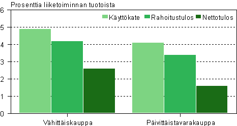 Kaupan alan korkeimmat kannattavuusluvut omaavalla vähittäiskaupan alalla käyttökateprosentti laski käyttökatteen supistumisen myötä. Käyttökatetta kertyi hieman alle puolitoista miljardia mikä vastasi 4,9 prosentin osuutta liiketoiminnan tuotoista. Kuitenkin rahoitustuotot kasvoivat kuluja nopeammin, jolloin rahoitustulosprosentti säilyi entisellään 4,2 prosentissa. Samoin nettotulosprosentti oli 2,6.