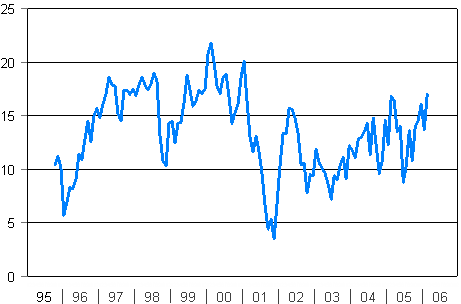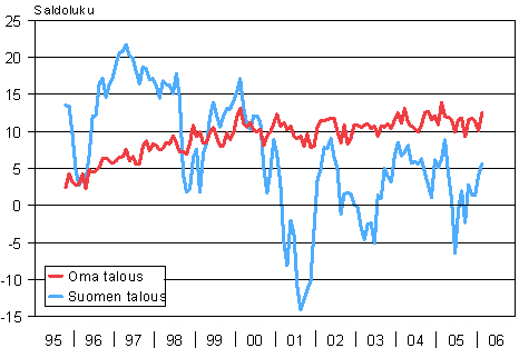 | Helmikuu 2006 saldoluku | Tammikuu 2006 saldoluku | Helmikuu 2005 saldoluku | Keskiarvo 10/95-2/06 | |