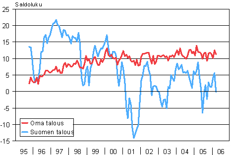 | Maaliskuu 2006 saldoluku | Helmikuu 2006 saldoluku | Maaliskuu 2005 saldoluku | Keskiarvo 10/95-3/06 | |