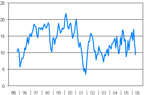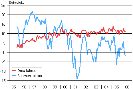 | Huhtikuu 2006 saldoluku | Maaliskuu 2006 saldoluku | Huhtikuu 2005 saldoluku | Keskiarvo 10/95-4/06 | |||||