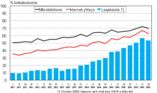 ISSN=2669-8862. elokuu 2006, Tietokoneiden ja internet-yhteyksien yleisyys kotitalouksissa neljännesvuosittain helmikuusta 2001 elokuuhun 2006 . Helsinki: Tilastokeskus [viitattu: 26.11.2025].