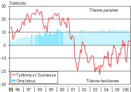 Kuluttajien odotukset työttömyydestä Suomessa ja omasta taloudestaan vuoden kuluttua 10/1995-8/2006