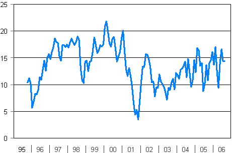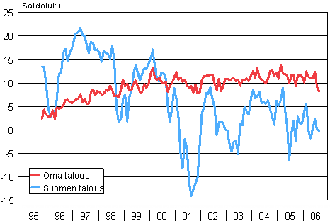 | Elokuu 2006 saldoluku | Heinäkuu 2006 saldoluku | Elokuu 2005 saldoluku | Keskiarvo 10/95-8/06 | |