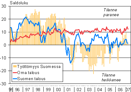 A1 Kuluttajien odotukset omasta ja Suomen taloudesta sekä työttömyydestä vuoden kuluttua 10/1995 - 03/2007