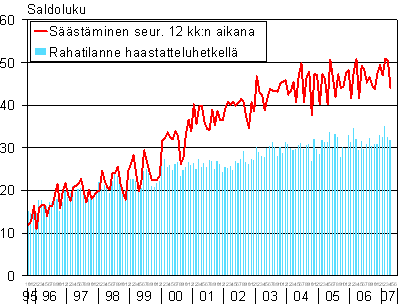 A2 Kuluttajien arviot kotitaloutensa säästämismahdollisuuksista seuraavan 12 kk aikana ja rahatilanteesta haastatteluhetkellä 10/1995-04/2007
