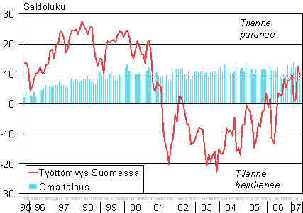 A1 Kuluttajien odotukset työttömyydestä Suomessa ja omasta taloudestaan vuoden kuluttua 10/1995 - 05/2007