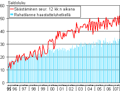 A2 Kuluttajien arviot kotitaloutensa säästämismahdollisuuksista seuraavan 12 kk aikana ja rahatilanteesta haastatteluhetkellä 10/1995 - 8/2007