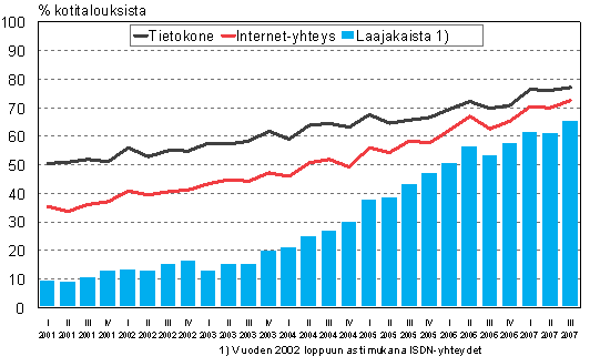C 2 Tietokoneiden ja internet-yhteyksien yleisyys kotitalouksissa neljännesvuosittain helmikuusta 2001 elokuuhun 2007