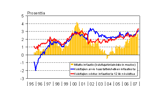 A7 Kuluttajien inflaationäkemykset ja mitattu inflaatio 10/1995 - 11/2007