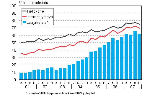 C2 Tietokoneiden ja internet-yhteyksien yleisyys kotitalouksissa neljännesvuosittain helmikuusta 2001 marraskuuhun 2007