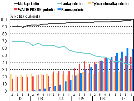 C3 Telelaitteet: puhelimien yleisyys kotitalouksissa neljännesvuosittain helmikuusta 2002 marraskuuhun 2007