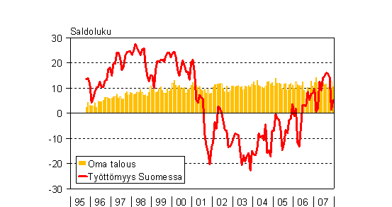 A1 Kuluttajien odotukset työttömyydestä Suomessa ja omasta taloudestaan vuoden kuluttua 10/1995 - 12/2007