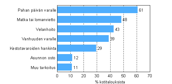 ISSN=2669-8862. huhtikuu 2008, B3 Säästämisen motiivit kotitalouksilla seuraavien 12 kuukauden aikana, huhtikuu 2008 . Helsinki: Tilastokeskus [viitattu: 26.11.2025].