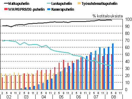 C 3 Telelaitteet: puhelimien yleisyys kotitalouksissa neljännesvuosittain helmikuusta 2002 toukokuuhun 2008