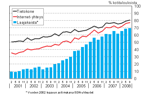 C 2 Tietokoneiden ja internet-yhteyksien yleisyys kotitalouksissa neljännesvuosittain helmikuusta 2001 ekokuuhun 2008