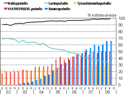 C 3 Telelaitteet: puhelimien yleisyys kotitalouksissa neljännesvuosittain helmikuusta 2002 elokuuhun 2008