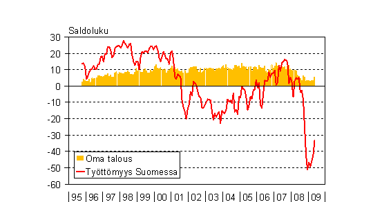 A1 Kuluttajien odotukset työttömyydestä Suomessa ja omasta taloudestaan vuoden kuluttua 10/1995 - 5/2009