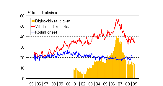 ISSN=2669-8862. kesäkuu 2009, A3 Kotitalouksien aikomukset käyttää rahaa kodintekniikan hankintaan seuraavan puolen vuoden aikana 10/1995 - 6/2009 . Helsinki: Tilastokeskus [viitattu: 26.11.2025].