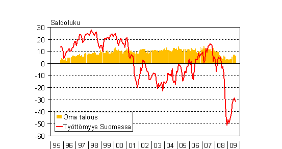 A1 Kuluttajien odotukset työttömyydestä Suomessa ja omasta taloudestaan vuoden kuluttua 10/1995 - 8/2009