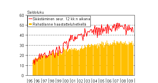 A2 Kuluttajien arviot kotitaloutensa säästämismahdollisuuksista seuraavan 12 kk aikana ja rahatilanteesta haastatteluhetkellä 10/1995-10/2009