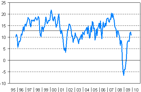 | Konsumenternas förtroendeindikator | 12,9 | 21,8 | -6,5 | -4,5 | 12,3 | 10,9 | +/- |