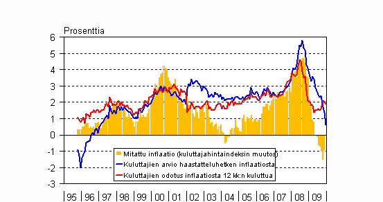 A8 Kuluttajien inflaationäkemykset ja mitattu inflaatio 10/1995-12/2009
