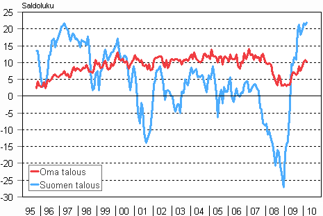 Maaliskuussa 56 prosenttia kuluttajista uskoi, että Suomen taloustilanne paranee seuraavan vuoden aikana. Kuluttajista 12 prosenttia puolestaan arvioi maamme talouden huononevan. Vastaavat osuudet olivat vuosi sitten pessimistiset 25 ja 45 prosenttia. Oman taloutensa kohentumiseen luotti maaliskuussa 28 prosenttia kuluttajista ja vain 10 prosenttia pelkäsi taloutensa huononevan vuoden kuluessa. Vuosi sitten nämä osuudet olivat 20 ja 14 prosenttia kuluttajista.