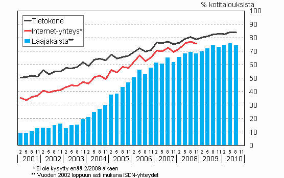 C 2 Tietokoneiden ja internet-yhteyksien yleisyys kotitalouksissa 2/2001-8/2010