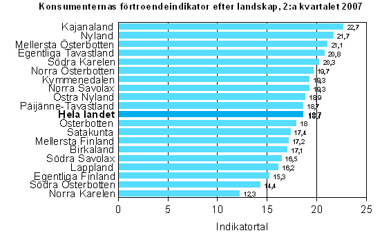 Konsumenternas inställningar i olika delar av landet visar att förtroendet för ekonomin i varje landskap var starkare än långtidsmedelvärdet. Av landskapen var förtroendet för ekonomin starkast i Kajanaland (23), Nyland (22), Mellersta Österbotten och Egentliga Tavastland (21) och svagast i Egentliga Finland (15), Södra Österbotten (14) och Norra Karelen (12).