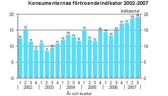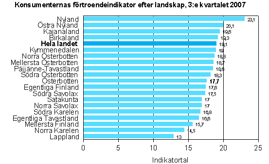 Konsumenternas förtroende för ekonomin har blivit starkare och under tredje kvartalet år 2007 hade konsumenterna en positivare inställning än på sju år. Konsumenternas förtroendeindikator hade ett värde på i genomsnitt 19,1 i hela landet, medan värdet för ett år sedan var 15,0 och för två år sedan 11,6. Förtroendeindikatorn överträffade sitt långtidsmedelvärde med drygt fem punkter. Förtroendet för ekonomin var starkare än långtidsmedelvärdet i alla landskap, något som visar hur konsumenterna ser på ekonomin i olika delar av landet.