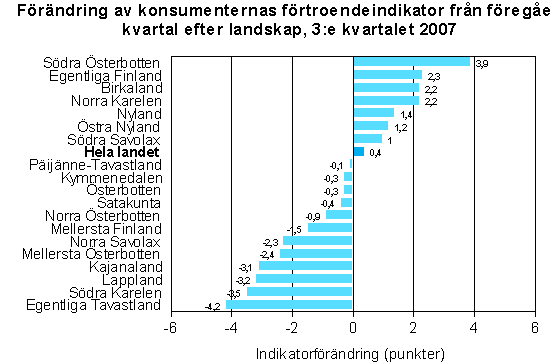 Konsumenternas förtroendeindikator ökade från föregående kvartal med 0,4 punkter i hela landet. Förändringarna i de enskilda landskapen var för det mesta små. Förtroendet för ekonomin ökade mest i Södra Österbotten 4 punkter samt i Egentliga Finland, Birkaland och Norra Karelen 2 punkter. Förtroendet försvagades i Egentliga Tavastland 4 punkter, Södra Karelen, Lappland och Kajanaland 3 punkter samt i Norra Österbotten och Norra Savolax 2 punkter. I övriga landskap var förväntningarna på ekonomin nästan oförändrade, då indikatorförändringarna var högst en punkt i någondera riktningen.