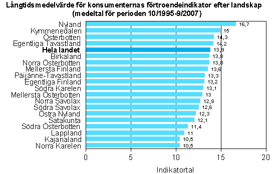 Konsumenternas förtroendeindikator hade ett långtidsmedelvärde i hela landet på 13,9. Fyra landskap låg ovanför medelvärdet och femton under. I täten låg Nyland (16,7) och Kymmenedalen (15), medan Norra Karelen, Kajanaland, Lappland och Södra Österbotten var bland de sista (omkring 11). Majoriteten av landskapen låg inom ett par punkters intervall från varandra, mellan 12 och 14.
