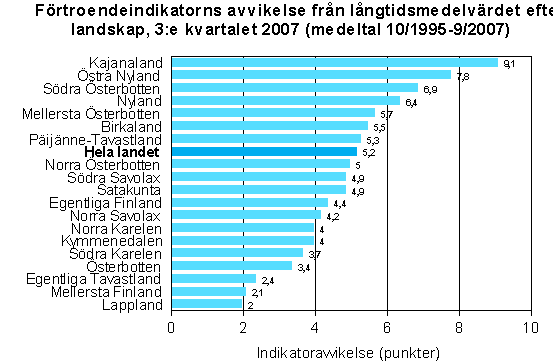 Indikatoravvikelsen från långtidsmedelvärdet var i hela landet +5,2 punkter. Med avvikelsen mätt var förtroendet relativt sett starkast i Kajanaland (+9), Östra Nyland (+8) och Södra Österbotten (+7), men svagare i Lappland, Mellersta Finland och Egentliga Tavastland (+2).