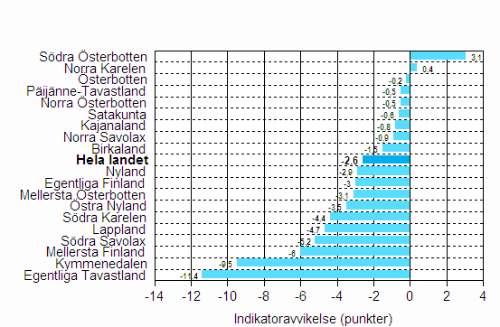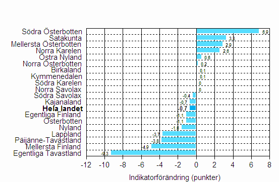 Värdet för förtroendeindikatorn sjönk från föregående kvartal med 0,7 punkter i hela landet. Förtroendet för ekonomin sjönk i 9 landskap, ökade i 8 landskap och var oförändrad i 2 landskap. Mest sjönk förtroendet i Egentliga Tavastland (-9,3 punkter) och ökade mest i Södra Österbotten (6,9 punkter).