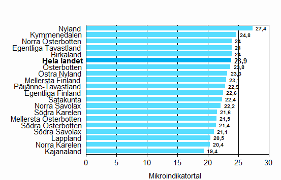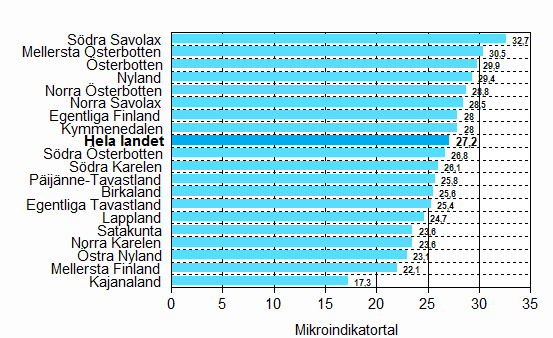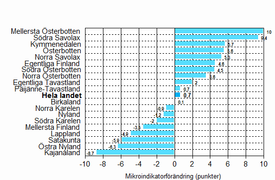 Mikroekonomiindikatorn var i genomsnitt +27,2 i hela landet under det första kvartalet år 2009. Indikatorn steg med 0,7 punkter från föregående kvartal och var i hela landet 2,7 punkter över långtidsmedelvärdet. Mikroekonomiindikatorn var bättre än långtidsmedelvärdet i 16 landskap och sämre i 3 landskap. De landskap som klarade sig bäst i den här jämförelsen var Södra Savolax (+12), Mellersta Österbotten (+9), Norra Savolax och Österbotten (+6) samt Egentliga Finland, Södra Österbotten och Norra Österbotten (+5). I Kajanaland (-2,1), Mellersta Finland (-1) och Östra Nyland (-0,2) låg man under långtidsmedelvärdet.