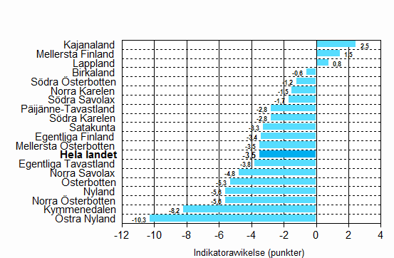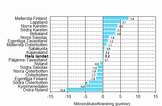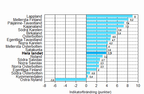 Förtroendeindikatorns värde förbättrades i hela landet med i genomsnitt 3,9 punkter. Förtroendet för ekonomin försvagadesi Östra Nyland med 5,9 punkter från föregående kvartal. I alla övriga landskap förbättrades förtroendet för ekonomin. Förtroendet förbättrades med sex punkter eller mer i Lappland, Mellersta Finland, Päijänne-Tavastland, Kajanaland, Södra Karelen och Birkaland. Förtroende förbättrades mindre än medeltalet för hela landet i Kymmenedalen, Södra Österbotten, Egentliga Finland, Norra Österbotten, Norra och Södra Savolax samt i Nyland.