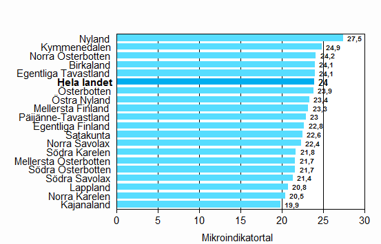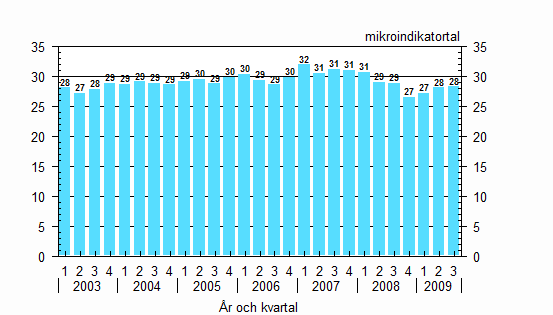 Mikroekonomiindikatorn var i genomsnitt +28,3 i hela landet under det tredje kvartalet år 2009. I täten bland landskapen var Kajanaland (+33) och Lappland (+31,7) . Bland de sista fanns Östra Nyland (+23,1) och Kymmenedalen (+24,2). Mikroindikatorns värde steg i hela landet med i medeltal 0,2 punkter från föregående kvartal.