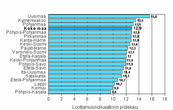 Suomalaisten kuluttajien talousluottamus parani neljännellä vuosineljänneksellä koko maassa runsaat kolme pistettä ja oli plussalla kaikissa maakunnissa. Luottamusindikaattorin arvo oli koko maassa keskimäärin +12,5. Mielialat olivat muita paremmat Itä-Uudellamaalla (+18,9), Satakunnassa (+14,5), Uudellamaalla (+14,2) ja Kymenlaaksossa (+14). Mielialat olivat muuta maata heikommat Kainuussa sekä Etelä- ja Pohjois-Karjalassa (+8)